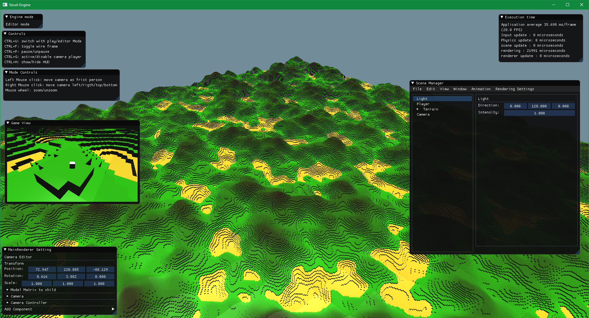 Conception d’un moteur 3D en OpenGL, avec une interface utilisateur développée via ImGui. Implémentation d’une génération procédurale de terrains voxel à l’aide de bruits procéduraux, optimisée pour un rendu efficace. Gestion avancée de l’affichage des voxels, de l’édition du terrain en temps réel et des collisions joueur-terrain. Développement d’un système d’acteurs et de composants permettant d’ajouter du gameplay de manière modulaire et intuitif.
